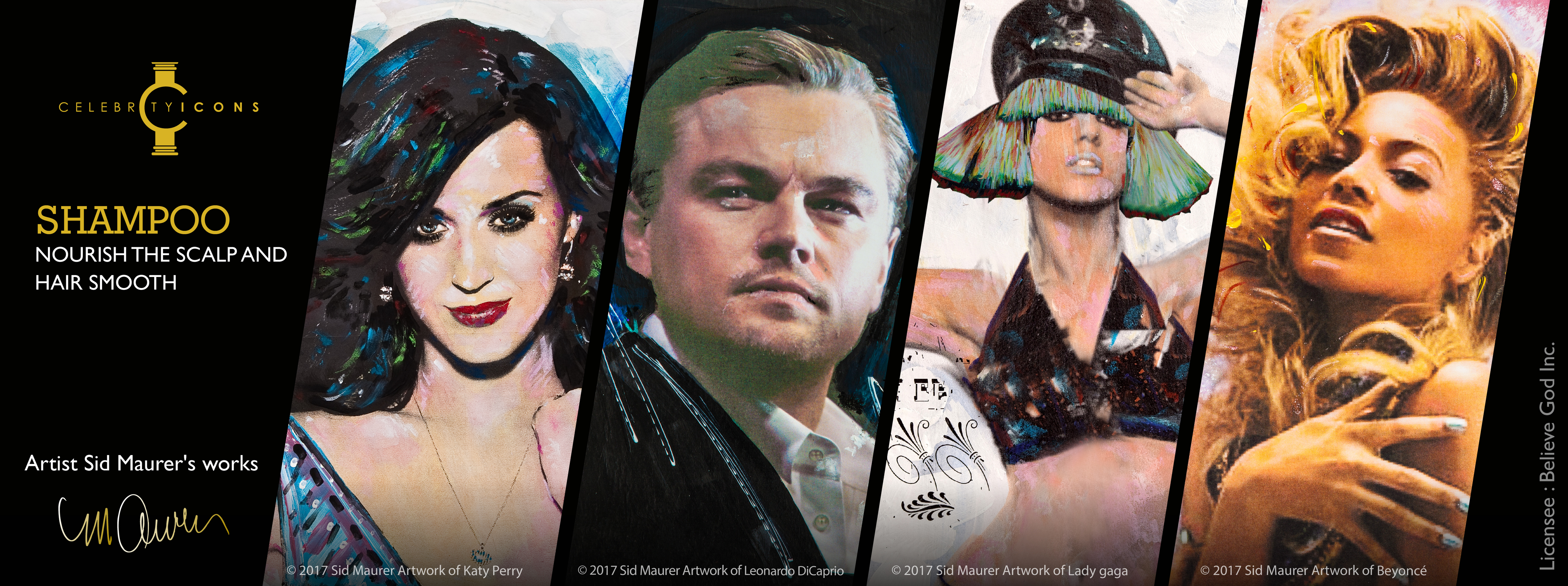 全球獨家亞洲首發的髮品限量商品,是台灣和Celebrity Icons 首度合作,因此不管是在產品內容的研發創新,還是設計包裝上都相當用心,女神卡卡.碧昂絲.凱蒂·佩芮.李奧納多4位巨星印在洗髮護髮產品上的畫像,是由50年代横跨藝術和音樂界的知名大師Sid Maurer所繪畫的作品,他的原畫與原創藝術簽名,在世界各地受到藏家的喜愛,價格不斷飆升。