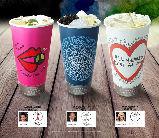 鮮茶道與「Whatever It Takes-愛 不惜一切」國際慈善聯盟合作,推出的全球唯一獨家授權紙杯,由「凱蒂派芮」、「莎莉賽隆」、「007丹尼爾克雷格」三位好萊塢大明星手繪設計,授權所得全數捐給公益,用於全球的難民、兒童教育、水資源等。